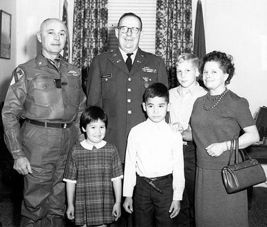 | The Base Commander at Fort Bragg, NC poses with the Breeden Family on the occasion of Major Breeden's retirement from the Army in 1968. (LtoR: Base Commander, Becky, Bob, Ken, Frank, Zalene.) |