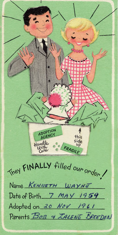 | Bob & Zalene Breeden adopted four (4) children during their marriage. Below are the original adoption announcements in birth order (L to R), bearing the name, date and location of each. (Click on each item to enlarge) |